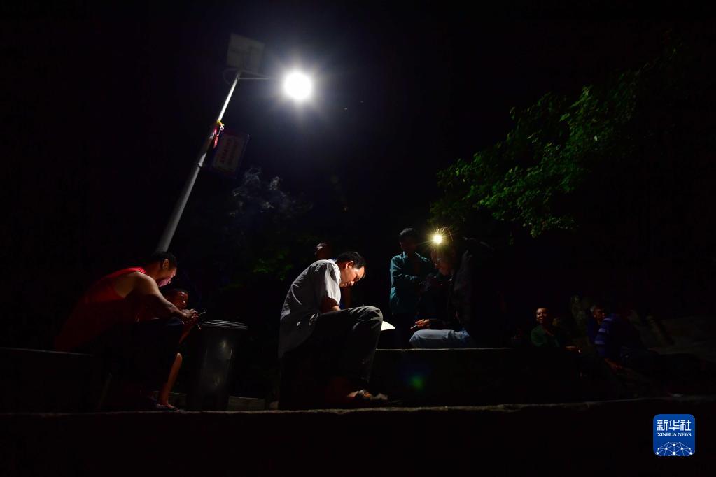 在广西融水苗族自治县杆洞乡党鸠村,村党总支书记、村委会主任梁成张(左二)在路灯下为村民办事(2020年5月13日摄)。 近年来,广西柳州市融水苗族自治县在脱贫攻坚和乡村振兴中,积极推进“村屯光亮工程”,在广大农村地区竖起一盏盏太阳能路灯,将大苗山村村寨寨的夜色点亮,提升村民的获得感和幸福感。 新华社记者 黄孝邦 摄 |