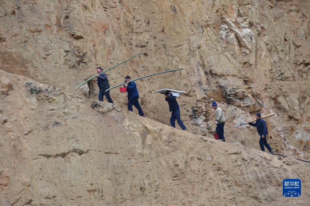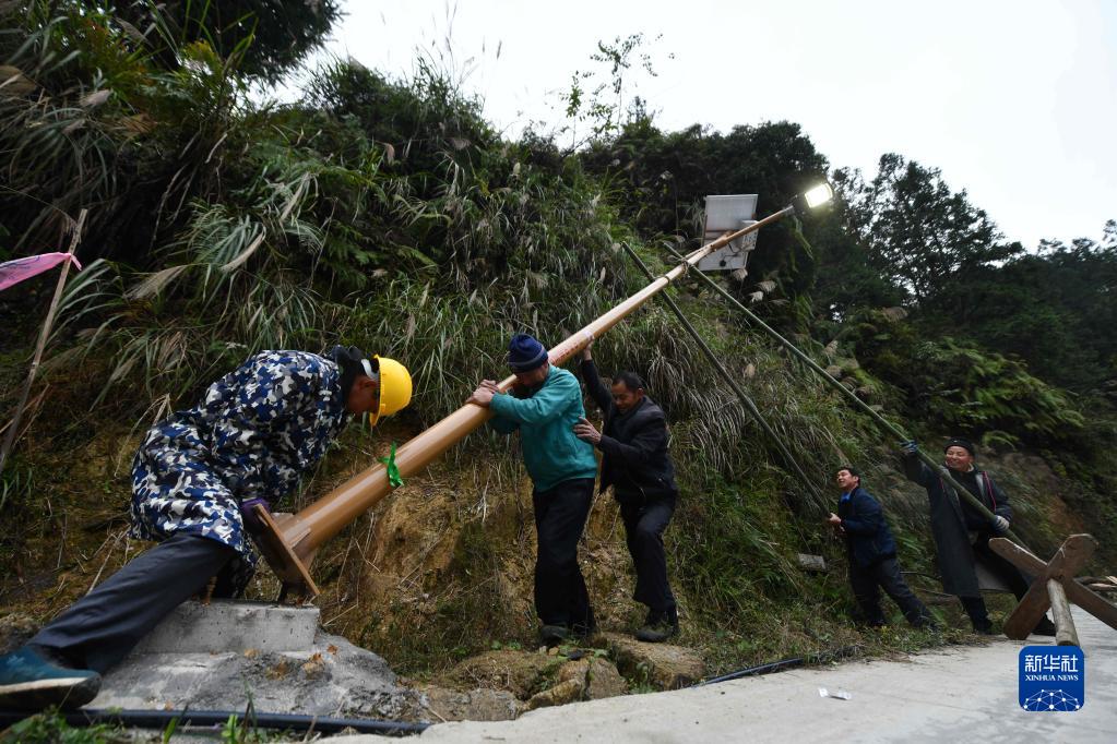 广西融水苗族自治县杆洞乡党鸠村村民在安装太阳能路灯(2020年12月7日摄)。 近年来,广西柳州市融水苗族自治县在脱贫攻坚和乡村振兴中,积极推进“村屯光亮工程”,在广大农村地区竖起一盏盏太阳能路灯,将大苗山村村寨寨的夜色点亮,提升村民的获得感和幸福感。 新华社记者 黄孝邦 摄