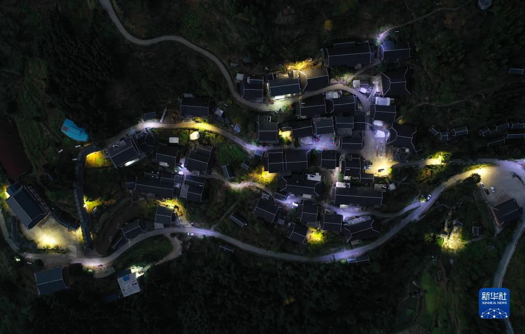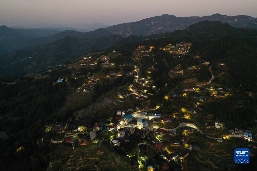 这是广西融水苗族自治县杆洞乡百秀村孔门苗寨夜景(无人机照片,11月25日摄)。 近年来,广西柳州市融水苗族自治县在脱贫攻坚和乡村振兴中,积极推进“村屯光亮工程”,在广大农村地区竖起一盏盏太阳能路灯,将大苗山村村寨寨的夜色点亮,提升村民的获得感和幸福感。 新华社记者 黄孝邦 摄