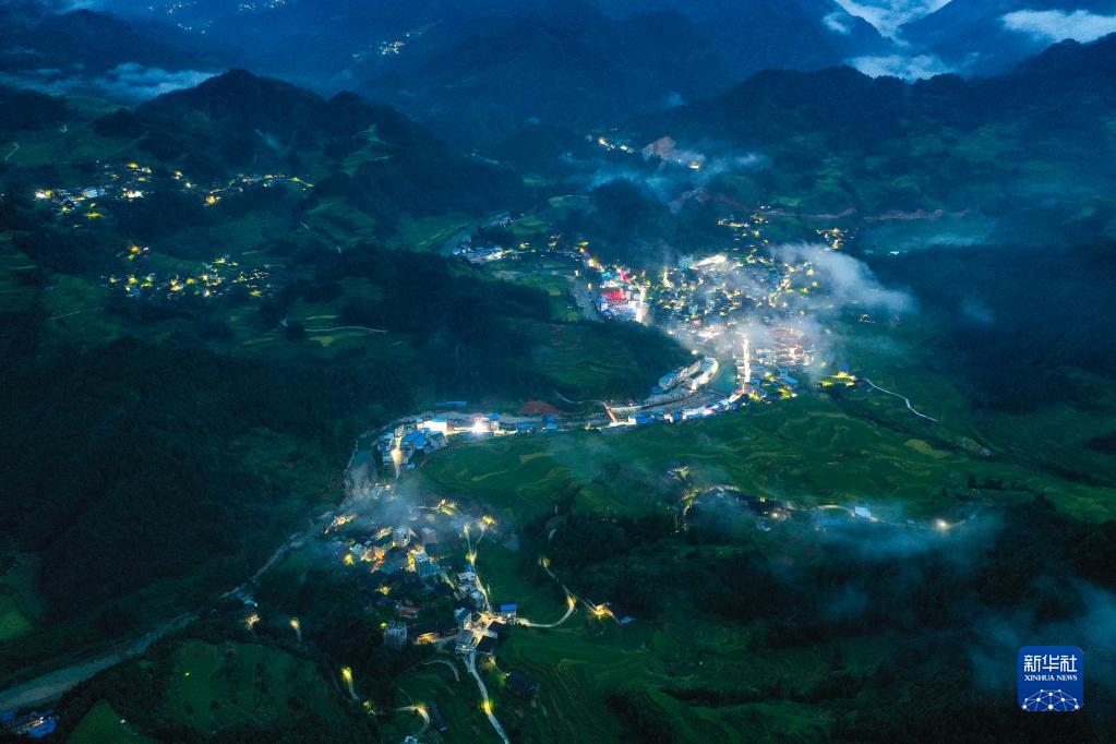 这是广西融水苗族自治县杆洞乡杆洞村和百秀村的夜景(无人机照片,8月27日摄)。 近年来,广西柳州市融水苗族自治县在脱贫攻坚和乡村振兴中,积极推进“村屯光亮工程”,在广大农村地区竖起一盏盏太阳能路灯,将大苗山村村寨寨的夜色点亮,提升村民的获得感和幸福感。 新华社记者 黄孝邦 摄