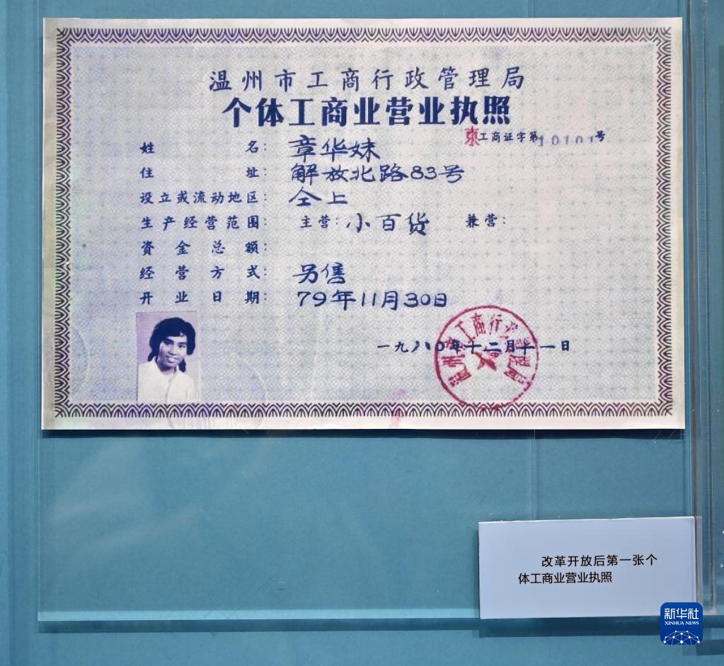 这是在 “伟大的变革——庆祝改革开放40周年大型展览”上拍摄的改革开放后第一张个体工商业营业执照(2018年11月15日摄)。