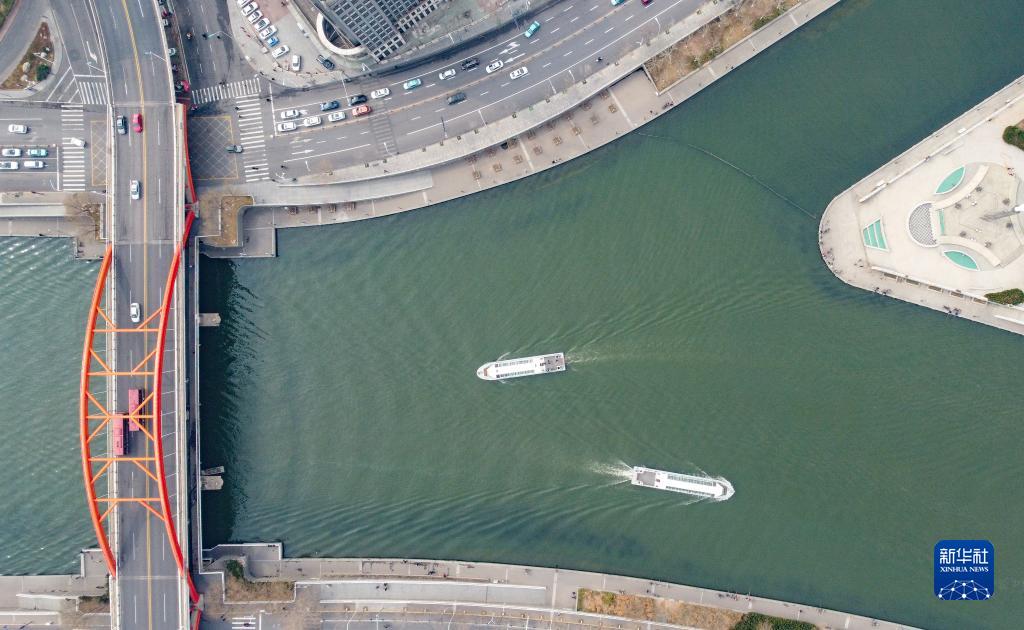 游船在天津海河三岔河口航行(无人机照片,3月19日摄)。