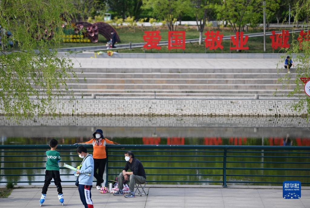 游人在天津市西青区中北镇的南运河广场休闲(2020年4月25日摄)。