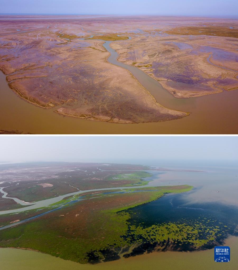 这是一张拼版照片:上图为2018年6月23日拍摄的山东黄河三角洲国家级自然保护区互花米草未治理时的画面;下图为2021年10月27日拍摄的山东黄河三角洲国家级自然保护区互花米草治理后的画面(无人机照片)。