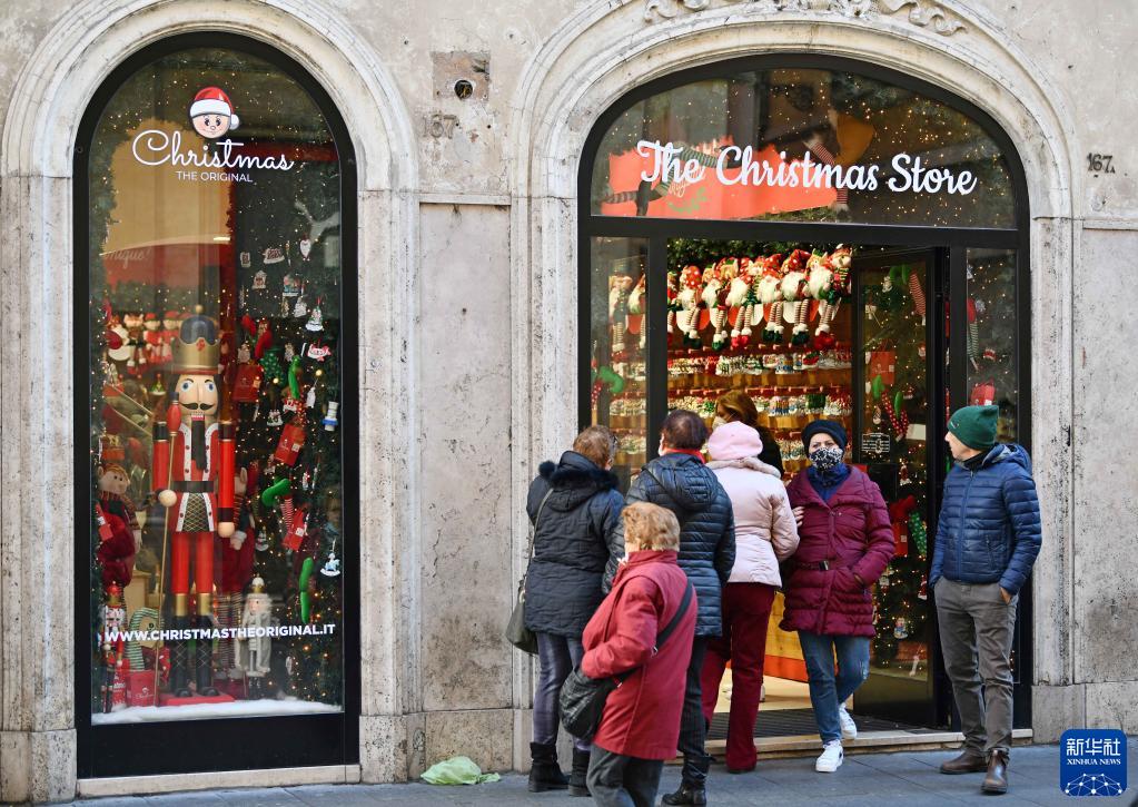 11月30日,人们聚集在意大利罗马一处圣诞商店门口。