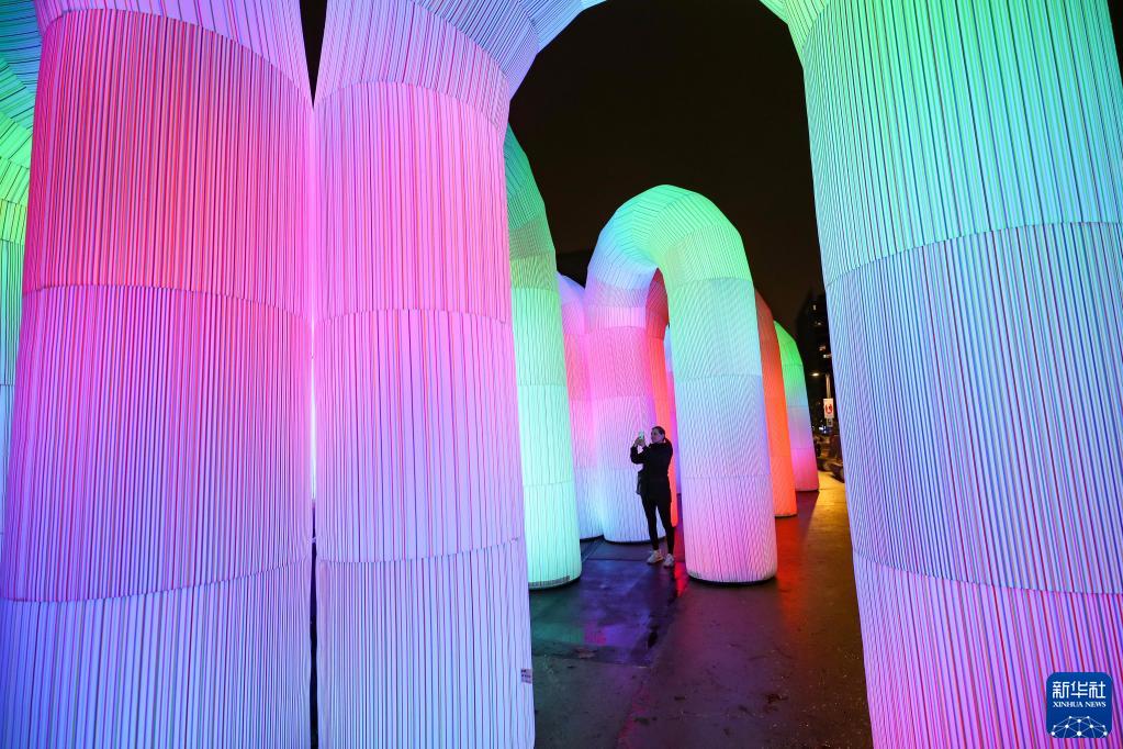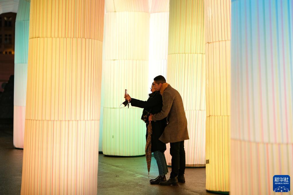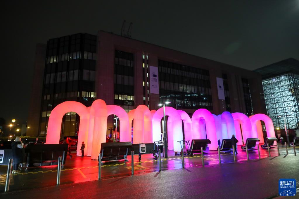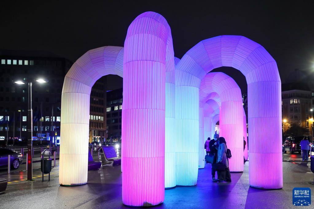 11月30日,游客在比利时布鲁塞尔的舒曼广场欣赏灯光艺术装置“天空城堡”。 为迎接即将到来的圣诞节和新年,布鲁塞尔市在欧盟总部所在地舒曼广场设立大型互动灯光装置艺术作品“天空城堡”。据了解,“天空城堡”由十余个拱门结构组成,运用声光电技术,可以给观众带来沉浸式体验,该作品于2021年11月30日至2022年1月1日免费向公众开放。 新华社记者 张铖 摄
