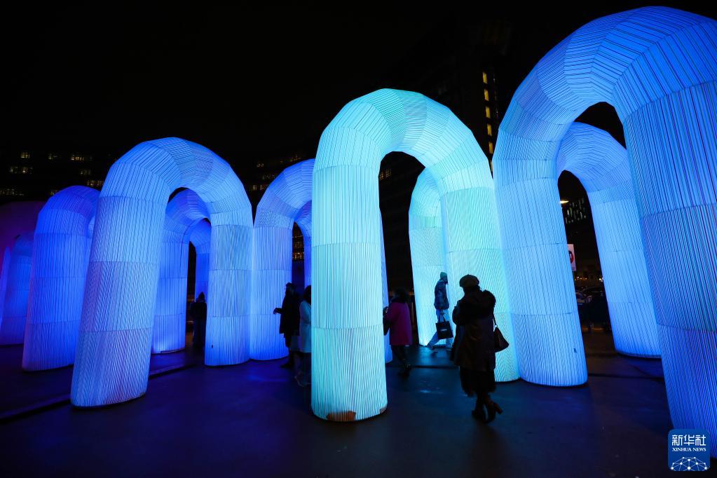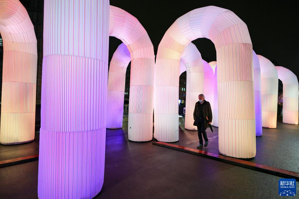 这是11月30日在比利时布鲁塞尔的舒曼广场拍摄的灯光艺术装置“天空城堡”。 为迎接即将到来的圣诞节和新年,布鲁塞尔市在欧盟总部所在地舒曼广场设立大型互动灯光装置艺术作品“天空城堡”。据了解,“天空城堡”由十余个拱门结构组成,运用声光电技术,可以给观众带来沉浸式体验,该作品于2021年11月30日至2022年1月1日免费向公众开放。 新华社记者 张铖 摄 |