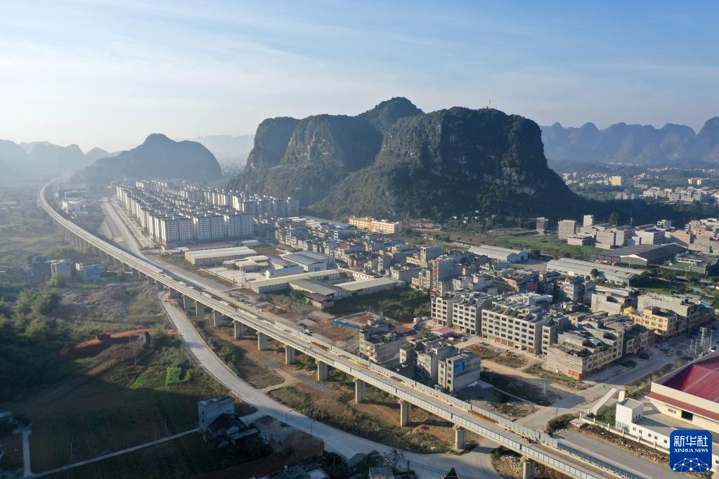 这是广西都安瑶族自治县境内正在修建的贵阳至南宁高铁及县城环城公路(12月1日摄,无人机照片)。