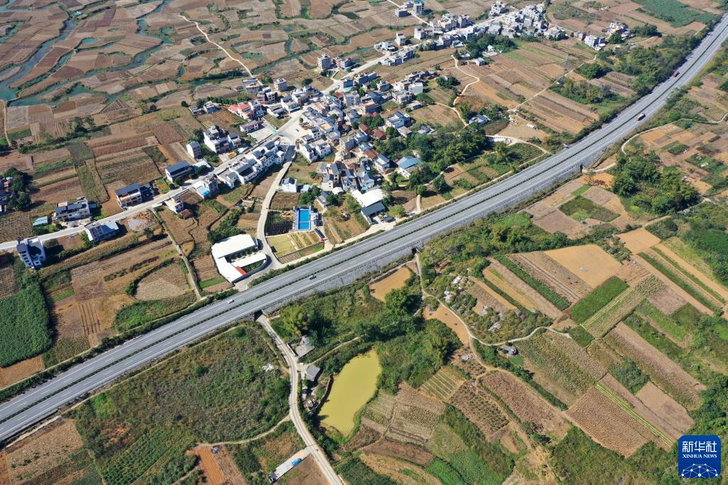 这是广西都安瑶族自治县境内的都安至河池高速公路及乡村道路(12月1日摄,无人机照片)。