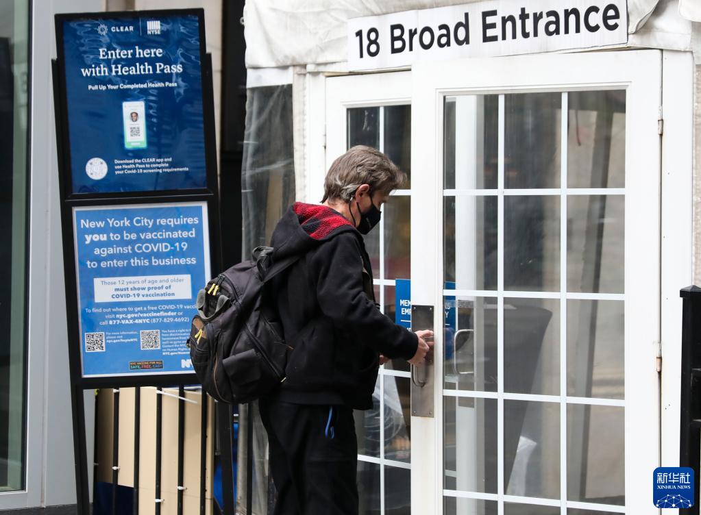 12月2日,在美国纽约,一名男子从一座大楼内的“必须佩戴口罩”提示牌旁走过。 包括纽约州在内的美国多个州2日宣布出现更多变异新冠病毒奥密克戎毒株感染病例。 新华社记者 王迎 摄