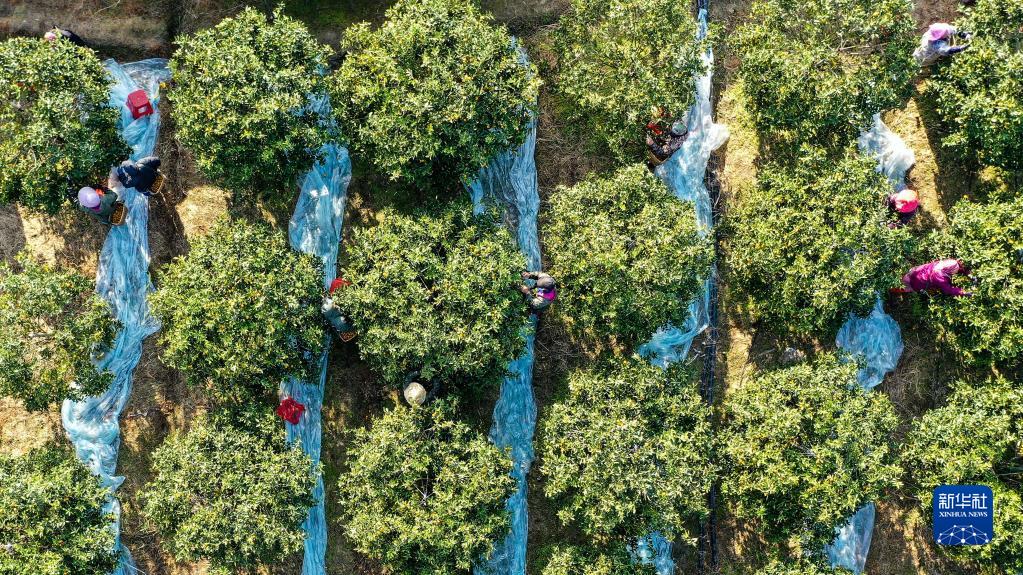 12月5日,在融安县万亩金桔园内,群众在采摘金桔(无人机照片)。