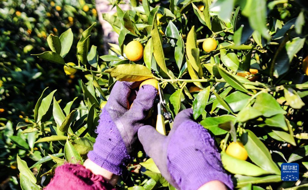 12月5日,在融安县万亩金桔园内,一名村民在采摘金桔。