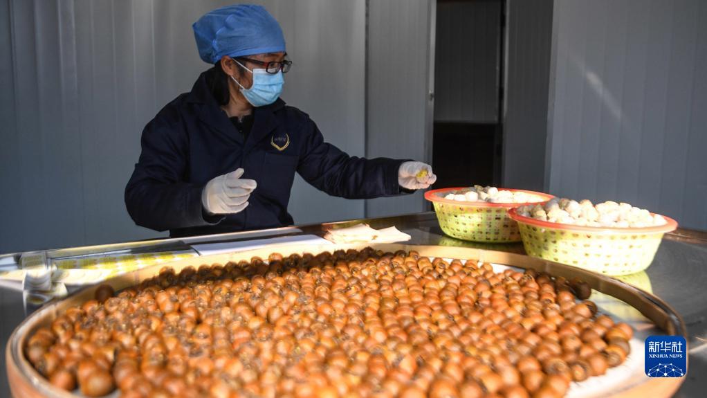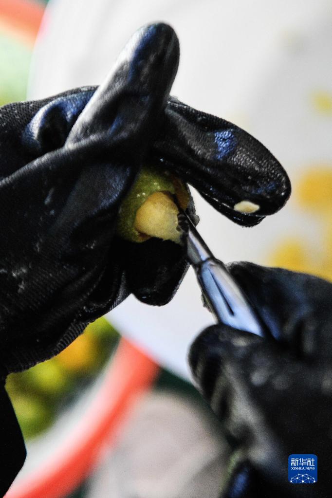 12月5日,在融安县一家金桔深加工企业,工人剔除金桔果肉制作金桔茶。