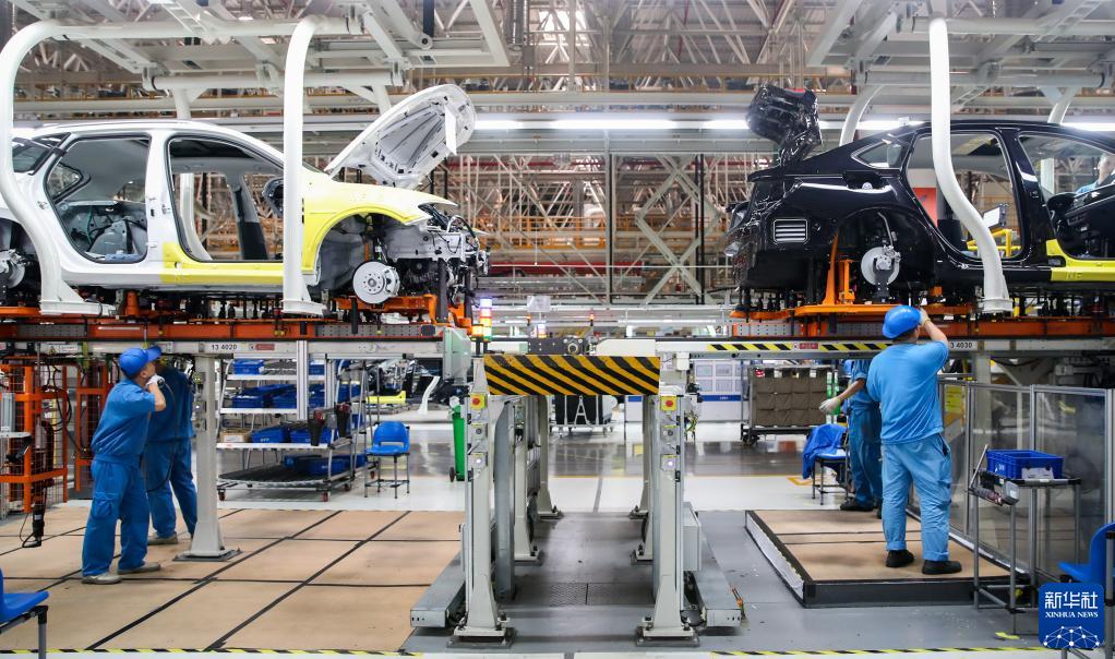 在上汽大众生产车间内,工作人员在生产流水线上作业(2018年10月30日摄)。