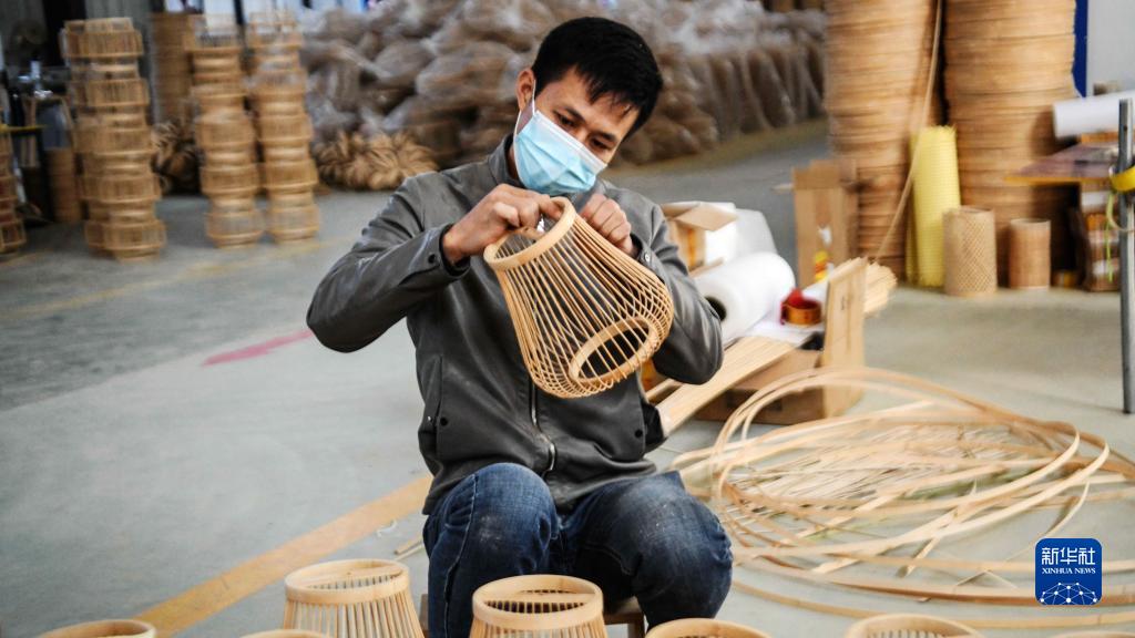 12月6日,融安县一家工艺品厂的工人在车间检查竹木灯饰半成品。