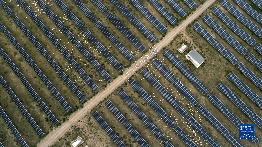 羊群在青海省海南藏族自治州共和光伏产业园吃草(2019年6月16日摄,无人机照片)。