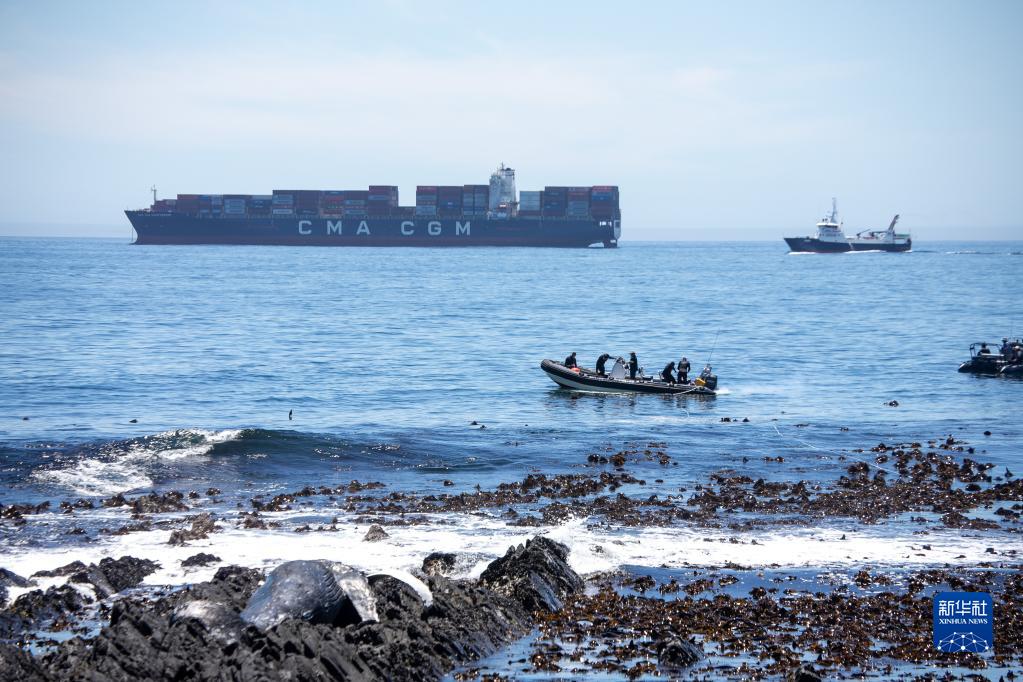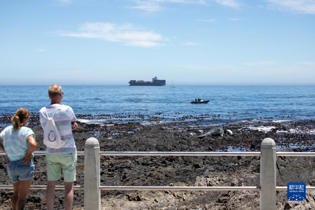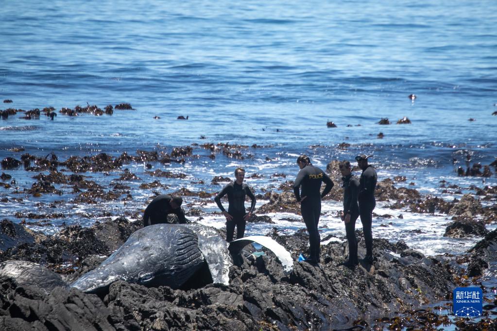 12月9日,在南非开普敦,警察站在海岸边的座头鲸尸体附近。 据当地媒体报道,当天上午一具座头鲸尸体在位于市区的海岸边被发现,当地政府随后在警方和海洋救援组织的协助下将尸体清理。 新华社记者 吕天然 摄