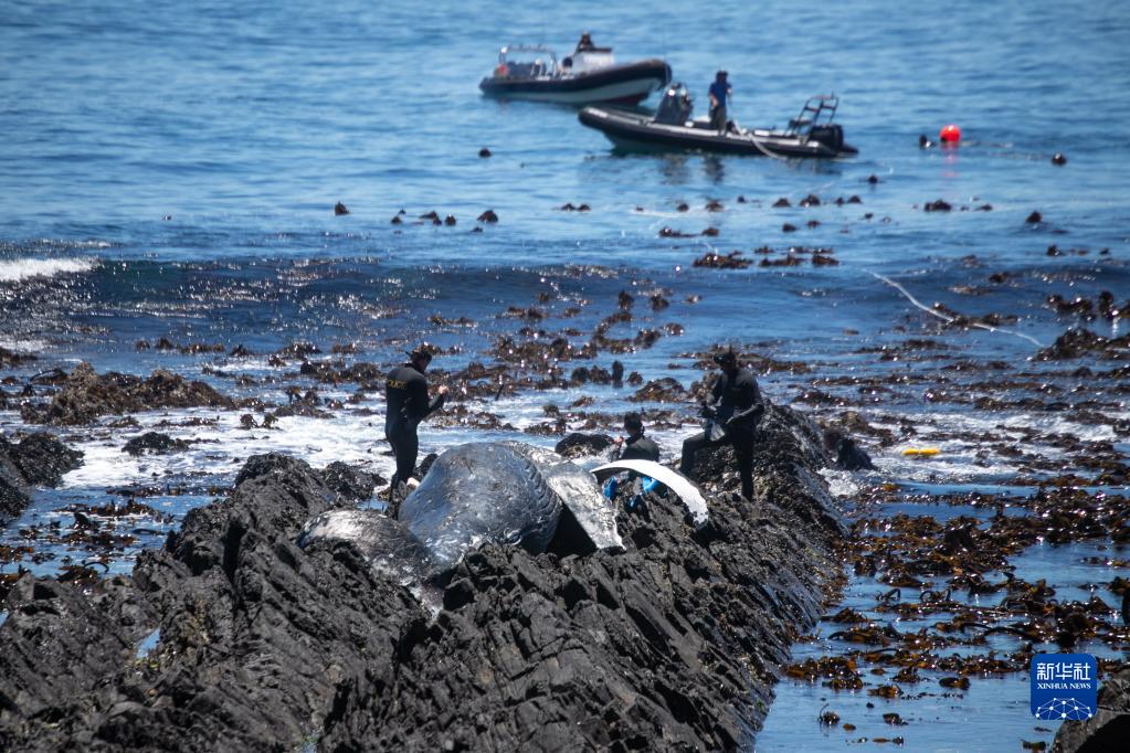 12月9日,在南非开普敦,工作人员准备转移海岸边的座头鲸尸体。 据当地媒体报道,当天上午一具座头鲸尸体在位于市区的海岸边被发现,当地政府随后在警方和海洋救援组织的协助下将尸体清理。 新华社记者 吕天然 摄