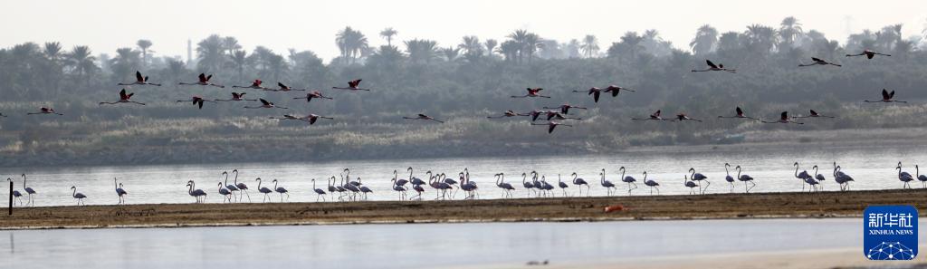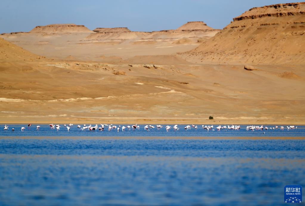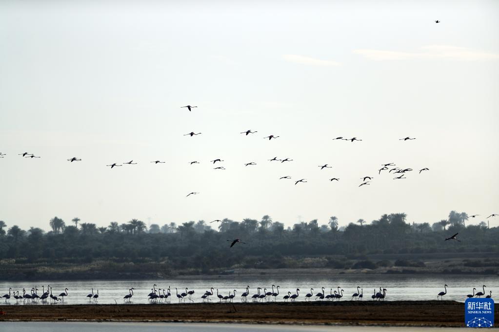 这是12月10日在埃及法尤姆省加龙湖拍摄的火烈鸟。 进入冬季,大批火烈鸟飞抵埃及法尤姆省内的加龙湖觅食越冬。 新华社记者 隋先凯 摄