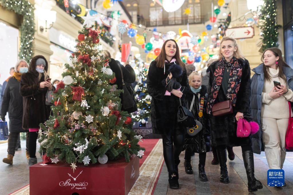 12月11日,在俄罗斯首都莫斯科的古姆百货商场,人们从新年枞树旁走过。