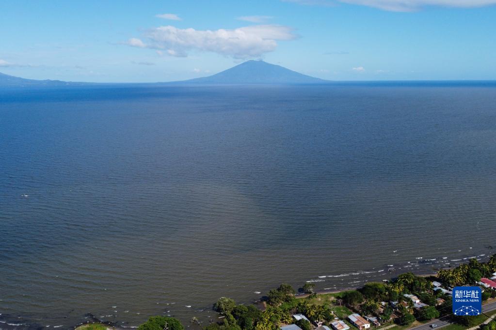 这是12月11日在尼加拉瓜里瓦斯附近拍摄的尼加拉瓜湖及远处的马德拉斯火山(无人机照片)。新华社记者 辛悦卫 摄