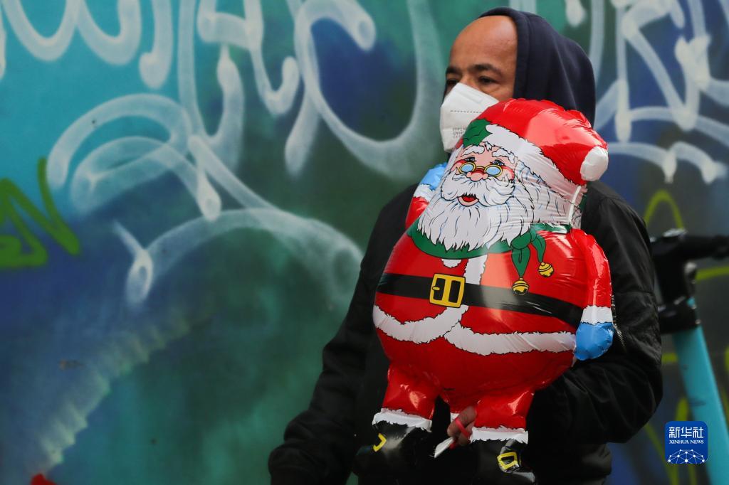12月11日,一名男子手持圣诞老人气球在比利时布鲁塞尔市中心行走。新华社记者郑焕松摄 |
