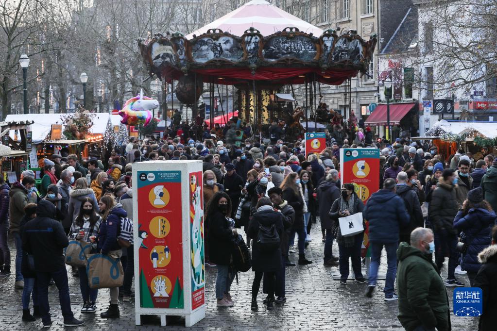 12月11日,人们在比利时布鲁塞尔市中心逛圣诞市场。 随着圣诞节和新年的临近,比利时首都布鲁塞尔的圣诞市场吸引了大批游客与市民。今年的活动在严格的防疫措施下举行,包括查验健康通行证、要求人们佩戴口罩、保持安全距离等。近日,比利时日均新增新冠确诊病例超过15000例,加上变异新冠病毒奥密克戎毒株来袭,防疫形势仍然严峻。 新华社记者郑焕松摄