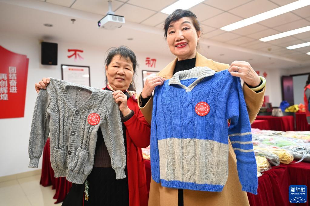 12月14日,志愿者展示编织的毛衣。 当日,福建省福州市的巾帼志愿者们将福州爱心人士编织的700多件“爱心毛衣”整理、打包,运上快递车,寄往新疆昌吉州奇台县,给奇台县的孩子们送去温暖。 新华社记者 林善传 摄