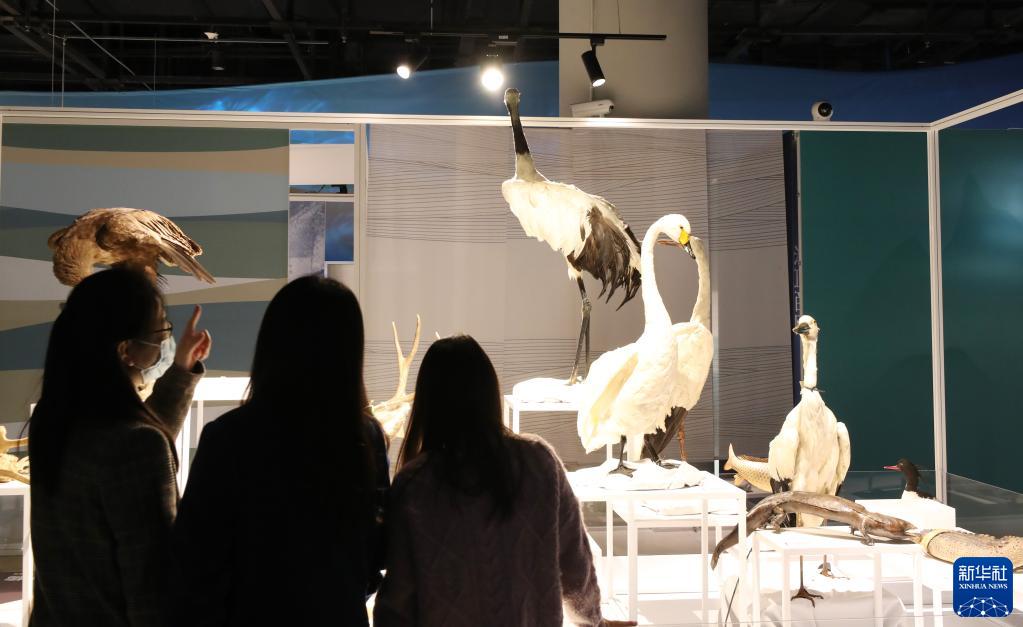 12月14日,参观者在长江流域动物标本展示台前驻足观看。