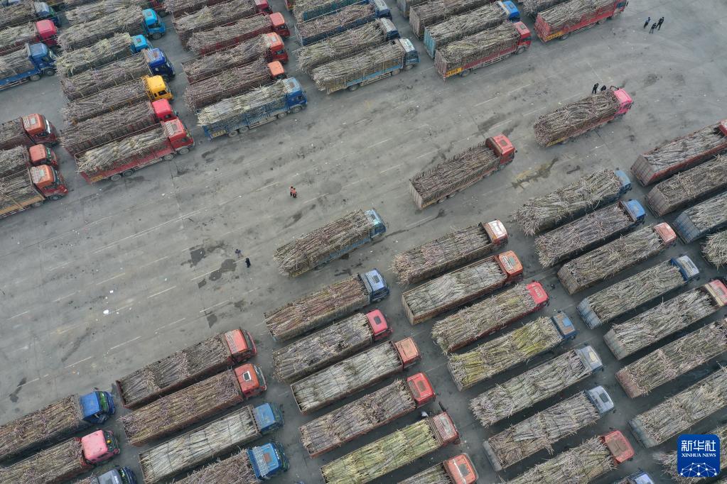 这是广西崇左市龙州县龙州糖厂排队等待进厂的运蔗车(12月15日摄,无人机照片)。