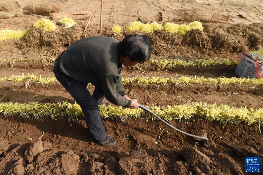 12月15日,在兰州市西固区张家大坪村,农民在收割韭黄。