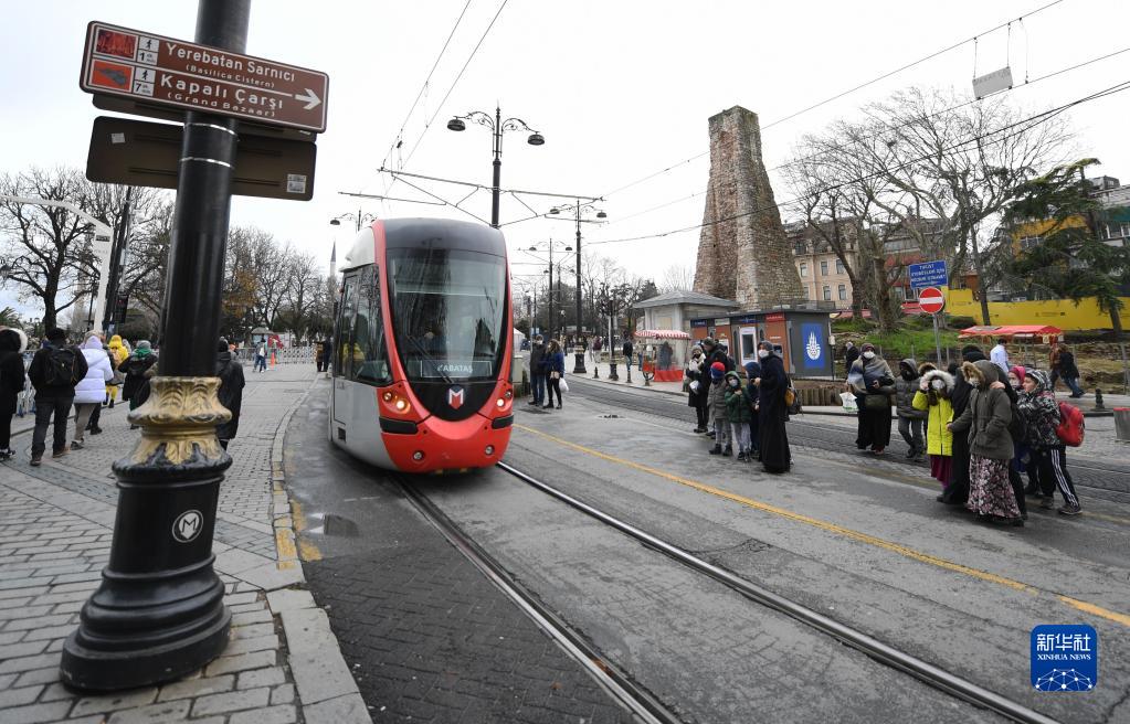 12月18日,游客在土耳其伊斯坦布尔等待一有轨电车驶过。