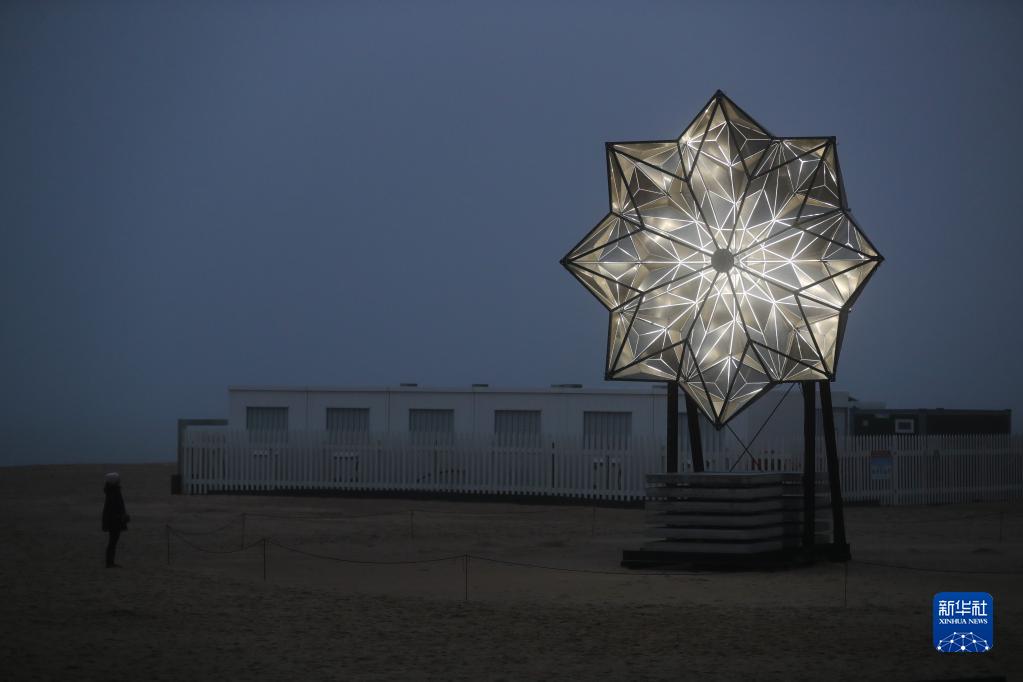 12月18日,在比利时克诺克海斯特海边,一名女子观看灯光艺术节上的一处艺术装置。 在比利时,冬季白昼时长较短,入夜后的灯光秀是广受人们喜爱的节日活动。近日,比利时西北部的海滨城市克诺克海斯特举办了一场灯光艺术节。艺术家们以“音乐”为主题设计的灯光艺术装置点缀城市多处,在冬夜为人们带来创意十足的视觉盛宴。 新华社记者 郑焕松 摄