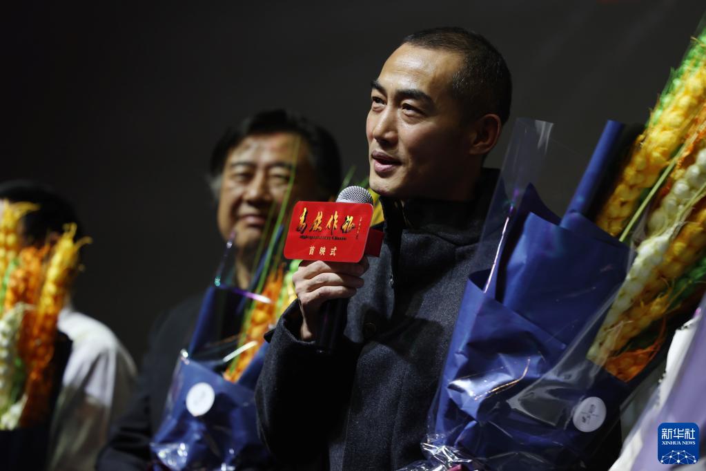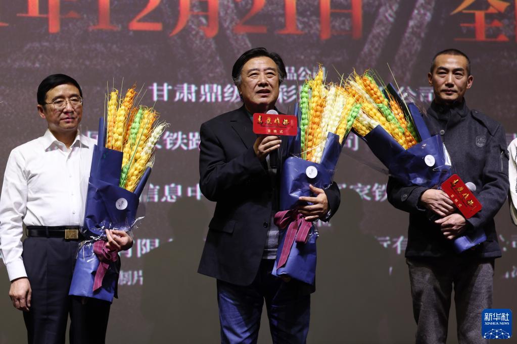 12月20日,演员艾东(右一)在电影《高铁作证》首映礼上与观众互动。新华社记者 陈斌 摄