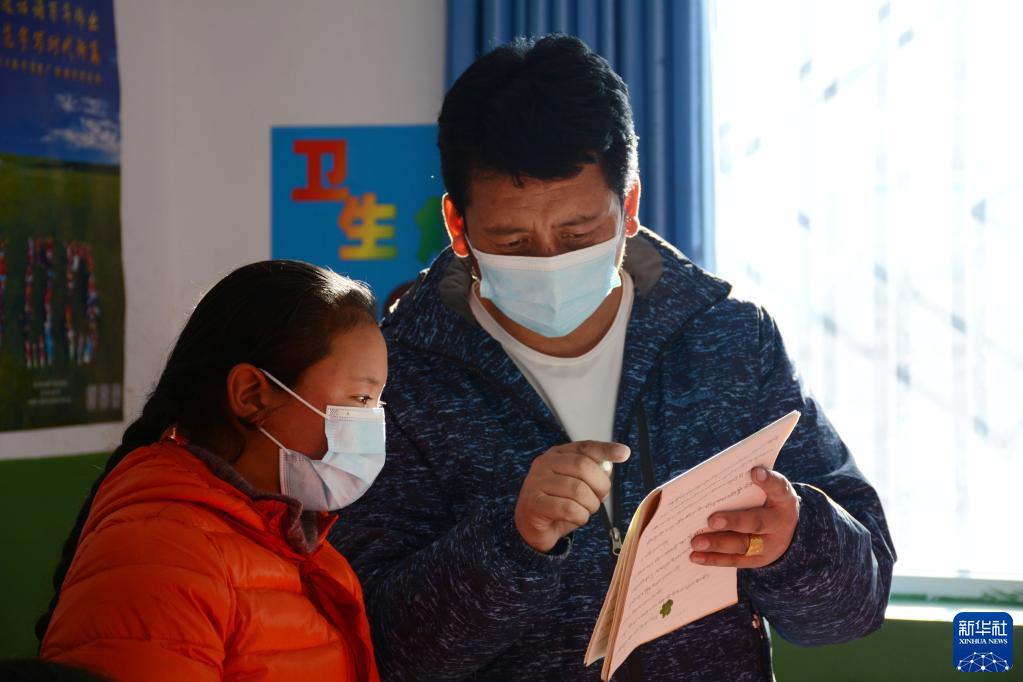 在青海省果洛藏族自治州玛多县地震灾后过渡安置一校区五年级二班,教师者才(右)在课堂上为学生辅导作业(12月18日摄)。新华社记者 柳泽兴 摄