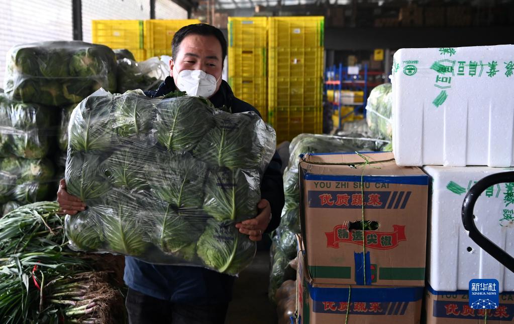 陕西米禾供应链管理股份有限公司的工作人员在搬运蔬菜(12月19日摄)。