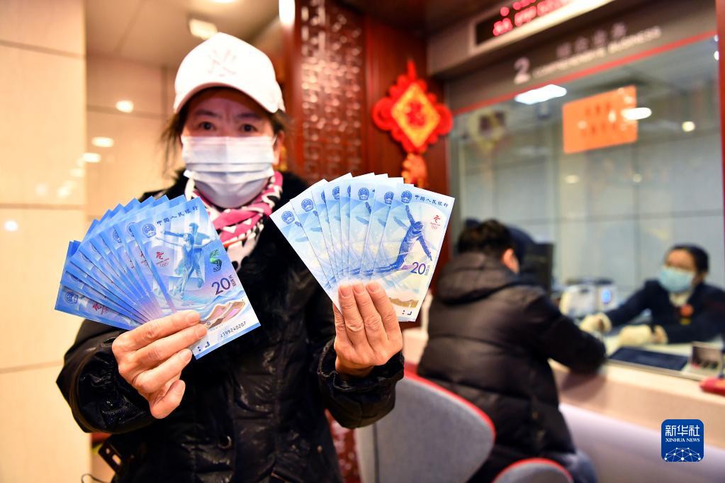 12月21日,市民李女士展示在中国工商银行北京西客站支行兑换的第24届冬季奥林匹克运动会纪念钞。