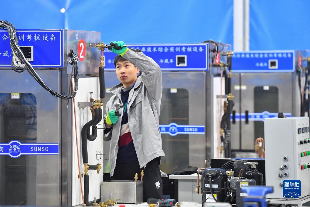12月22日,在长沙贺龙体育中心,选手在制冷与空调项目比赛现场排查设备故障。