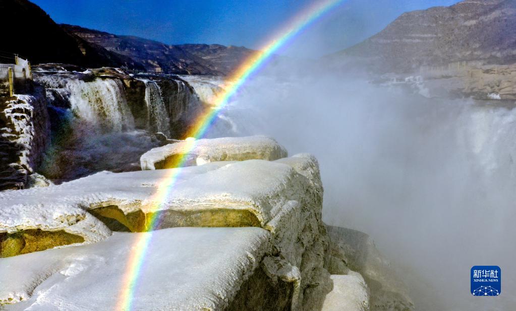 黄河壶口瀑布冰瀑与彩虹交相辉映(12月21日摄)。 近日,随着气温骤降,黄河壶口瀑布呈现出别样奇观:飞溅的浪花,在两岸崖壁之上凝固成巨大冰瀑,点缀着一条条银装素裹的冰柱,玲珑剔透,错落有致;激起的水雾,在阳光的映射下,彩虹横亘其间,宛如一幅幅画卷。 新华社记者 陶明 摄
