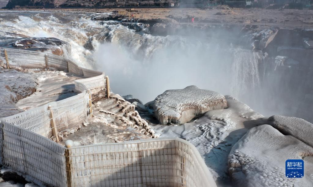 黄河壶口瀑布陕西岸边的冰柱围栏(12月21日摄,无人机照片)。 近日,随着气温骤降,黄河壶口瀑布呈现出别样奇观:飞溅的浪花,在两岸崖壁之上凝固成巨大冰瀑,点缀着一条条银装素裹的冰柱,玲珑剔透,错落有致;激起的水雾,在阳光的映射下,彩虹横亘其间,宛如一幅幅画卷。 新华社记者 陶明 摄
