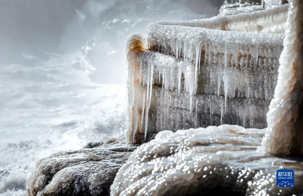 近日,随着气温骤降,黄河壶口瀑布呈现出别样奇观:飞溅的浪花,在两岸崖壁之上凝固成巨大冰瀑,点缀着一条条银装素裹的冰柱,玲珑剔透,错落有致;激起的水雾,在阳光的映射下,彩虹横亘其间,宛如一幅幅画卷。