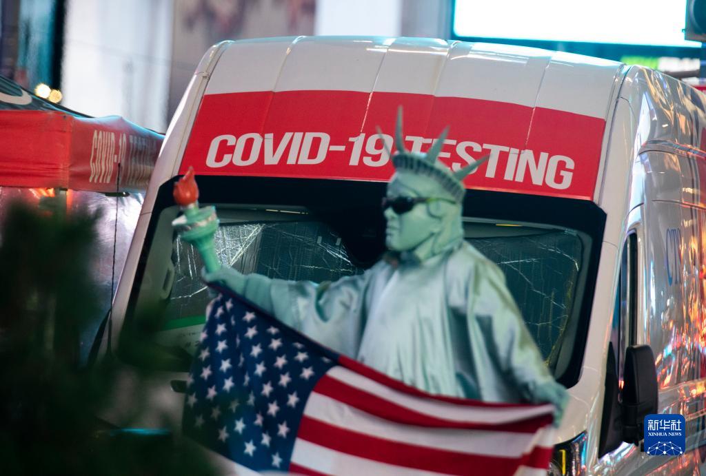12月20日,一名街头演员在美国纽约时报广场一处临时核酸检测点旁表演。