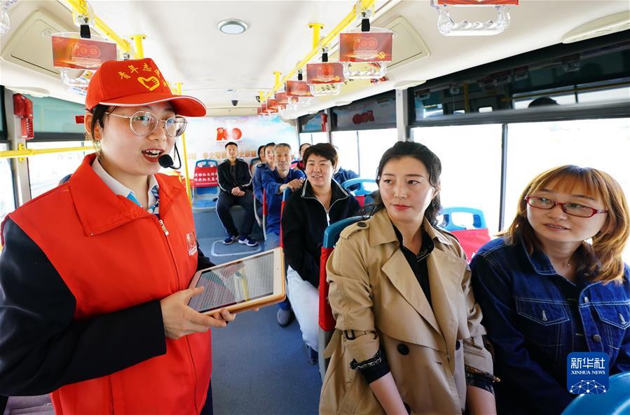 河北省唐山市海港经济开发区志愿者宣讲员在红色主题公交车上给乘客讲革命故事(5月10日摄)。新华社记者 杨世尧 摄