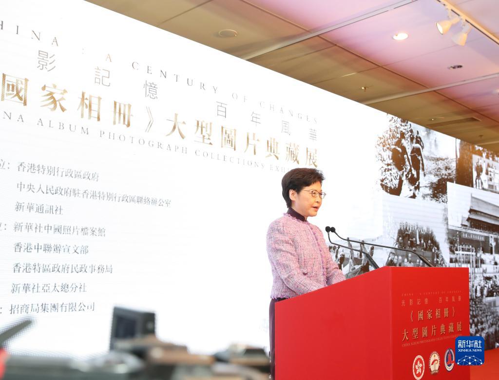 在香港中央图书馆,香港特区行政长官林郑月娥在“光影记忆 百年风华——《国家相册》大型图片典藏展”的开幕式上致辞(10月8日摄)。