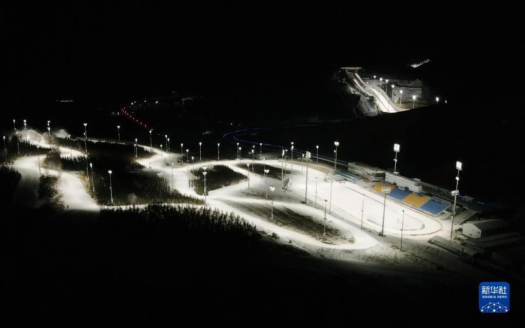 这是2021年12月30日拍摄的张家口赛区国家越野滑雪中心(下)和国家跳台滑雪中心夜景(无人机照片)。新华社记者 杨世尧 摄