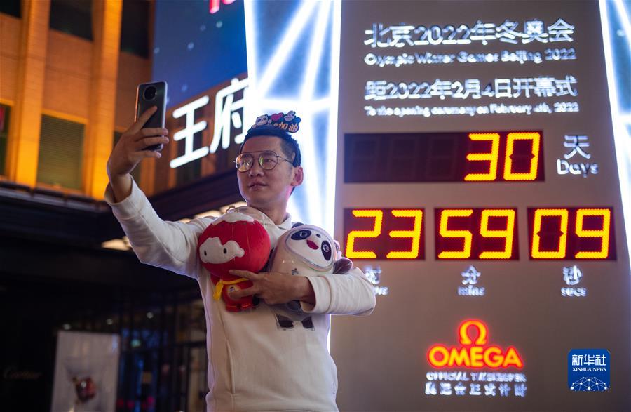 1月4日,一位市民在位于北京王府井大街的北京2022年冬奥会倒计时牌前自拍。 当日,北京2022年冬奥会迎来开幕倒计时一个月。 新华社记者 陈钟昊 摄