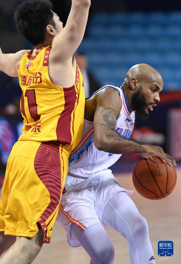 1月10日,山西汾酒股份队球员周湛东(左)在比赛中防守福建浔兴股份队球员高登。 当日,在吉林长春进行的2021-2022赛季中国男子篮球职业联赛(CBA)第二阶段第21轮比赛中,山西汾酒股份队以120比109战胜福建浔兴股份队。 新华社记者 颜麟蕴 摄
