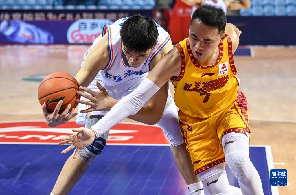 1月10日,山西汾酒股份队球员原帅(右)与福建浔兴股份队球员孙喆在比赛中争抢。 当日,在吉林长春进行的2021-2022赛季中国男子篮球职业联赛(CBA)第二阶段第21轮比赛中,山西汾酒股份队以120比109战胜福建浔兴股份队。 新华社记者 颜麟蕴 摄