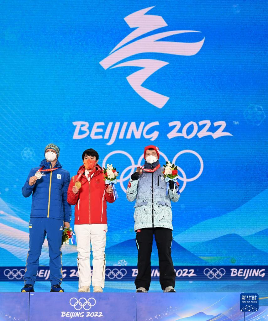 2月17日,冠军中国选手齐广璞(中)、亚军乌克兰选手亚历山大·阿布拉缅科(左)与季军俄罗斯奥委会选手伊利亚·布罗夫在奖牌颁发仪式上。