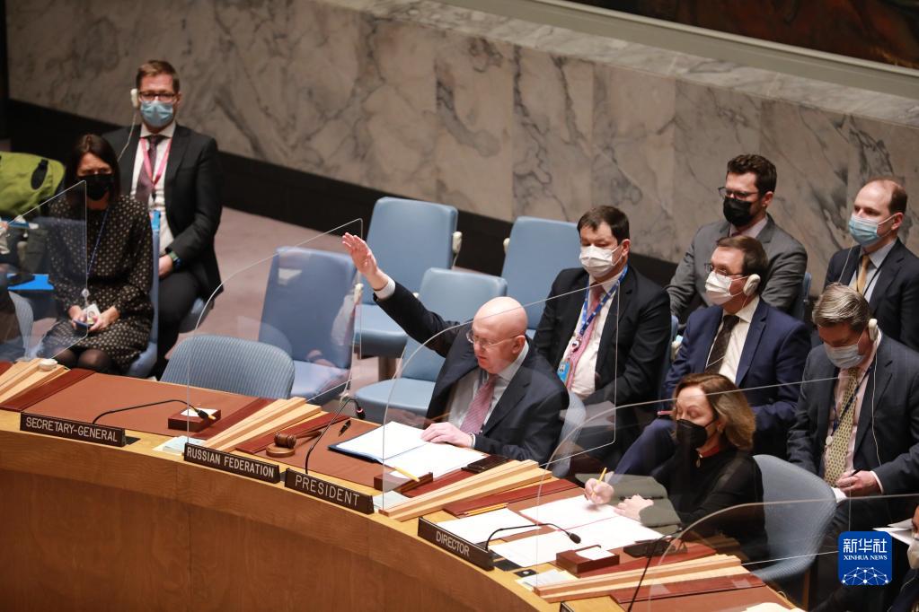 2月25日,在位于纽约的联合国总部,俄罗斯常驻联合国代表瓦西里·涅边贾(前中)就决议草案投否决票。